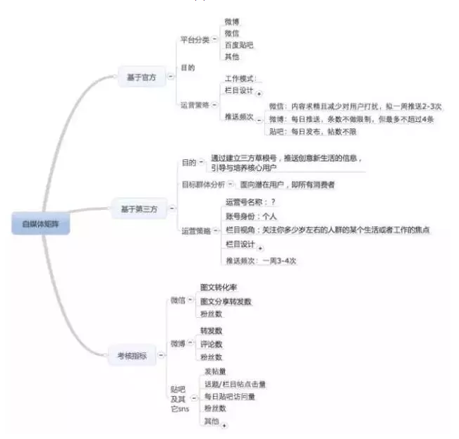 这张思维导图是让你脑海中有一个新媒体矩阵,了解作为一名新媒体运营,除了运营好自己官方的帐号,和第三方大号的合作也非常重要,所谓借力打力,最后你要了解你的考核指标,组建一个这样的思维矩阵后,既可以清楚知道工作方向,又可以打破现有的思维格局。